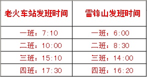 7月6日:開(kāi)通老火站至古塘、雷鋒山的農(nóng)村客運(yùn)班車,每天四班,運(yùn)行線路及發(fā)班時(shí)間如下: